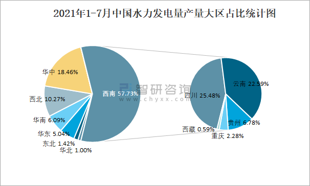 2021年1-7月中國水力發電量產量大區占比統計圖