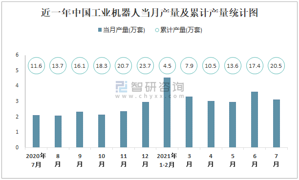2021年1-7月中國工業機器人產量為20.5萬套 累計增長64.6%