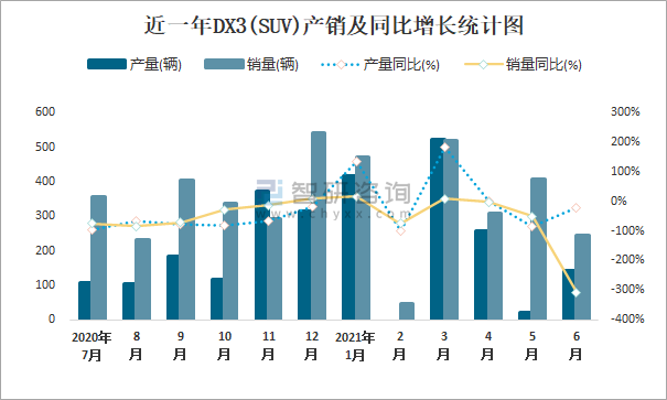 根據中國汽車工業協會數據可知:2021年6月DX3(SUV)產量為141輛,同比下降21.7%,銷量為244輛,同比下降306.8%,當月產銷率為173.05%;2021年上半年DX3(SUV)產量為1359輛,同比增長86.2%,銷量為1999輛,同比下降4.1%,產銷率為147.09%;2016-2020年DX3(SUV)產銷量均在2017年達到最高值,此后逐年遞減,且近5年總產量大于總銷量,積壓了庫存1877輛。