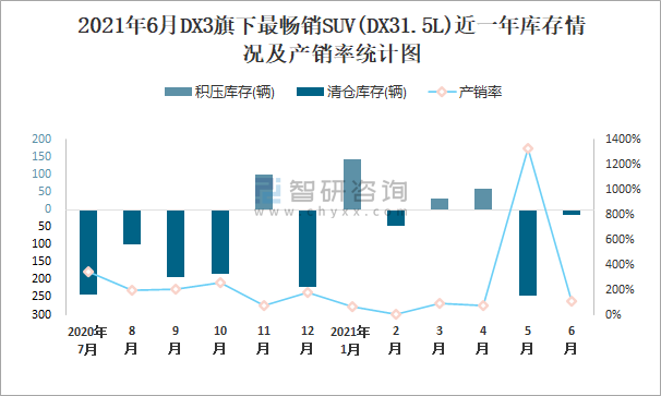 2021年6月DX3旗下最暢銷SUV(DX31.5L)近一年庫存情況及產銷率統計圖