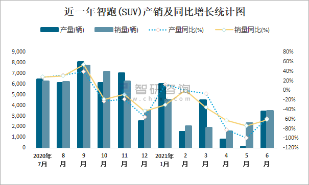 根據中國汽車工業協會數據可知:2021年6月智跑(SUV)產量為3433輛,同比下降59.1%,銷量為3499輛,同比下降61.1%,當月產銷率為101.92%;2021年上半年智跑(SUV)產量為16362輛,同比下降47.6%,銷量為15860輛,同比下降49.7%,產銷率為96.93%;2014-2020年智跑(SUV)產銷量均在2017年跌至最低值,此后大幅度上升,且近7年總銷量大于總產量,清倉庫存3327輛。