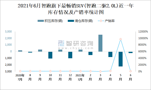 2021年6月智跑旗下最暢銷SUV(智跑二驅2.0L)近一年庫存情況及產銷率統計圖