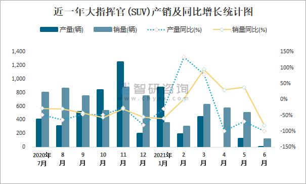 近一年大指揮官(SUV)產(chǎn)銷及同比增長(zhǎng)統(tǒng)計(jì)圖