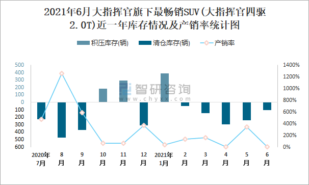 2021年6月大指揮官旗下最暢銷SUV(大指揮官四驅(qū)2.0T)近一年庫(kù)存情況及產(chǎn)銷率統(tǒng)計(jì)圖