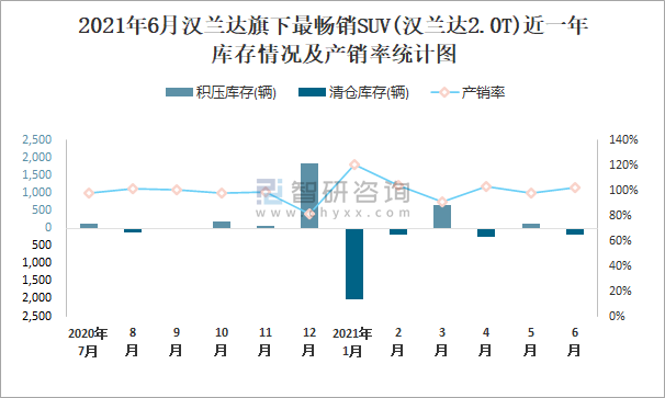 2021年6月漢蘭達旗下最暢銷SUV(漢蘭達2.0T)近一年庫存情況及產銷率統計圖