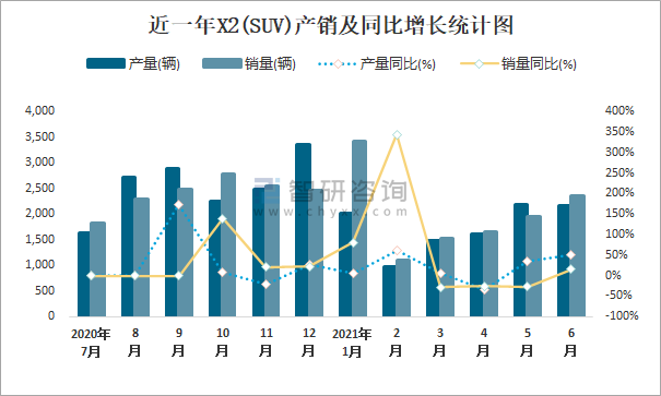 近一年X2(SUV)產(chǎn)銷及同比增長(zhǎng)統(tǒng)計(jì)圖