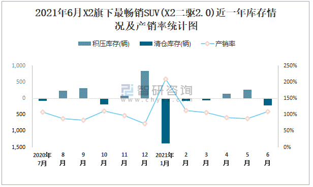 2021年6月X2旗下最暢銷SUV(X2二驅(qū)2.0)近一年庫(kù)存情況及產(chǎn)銷率統(tǒng)計(jì)圖