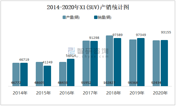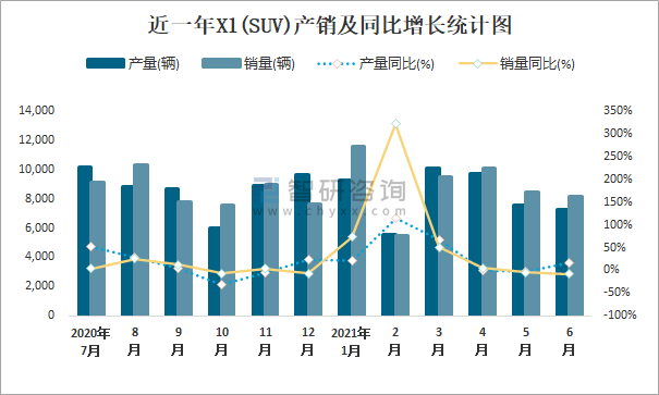 根據中國汽車工業協會數據可知:2021年6月X1(SUV)產量為7249輛,同比增長17.5%,銷量為8194輛,同比下降8.6%,當月產銷率為113.04%;2021年上半年X1(SUV)產量為49513輛,同比增長23.4%,銷量為53322輛,同比增長27.9%,產銷率為107.69%;2014-2020年X1(SUV)產銷量均在2018年達到最高值,此后總體呈現下降趨勢,且近7年總產量大于總銷量,積壓了庫存3321輛。