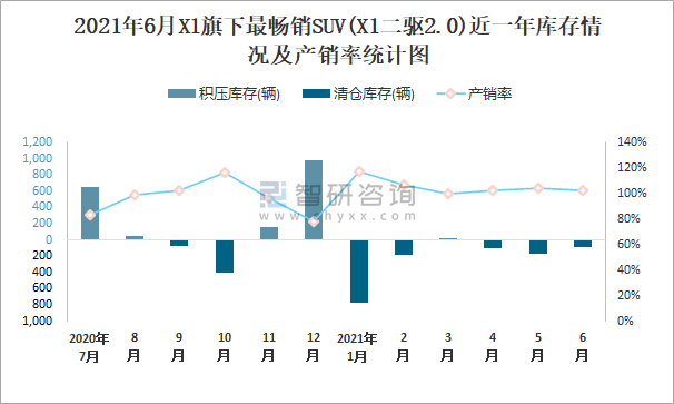 2021年6月X1旗下最暢銷SUV(X1二驅2.0)近一年庫存情況及產銷率統計圖