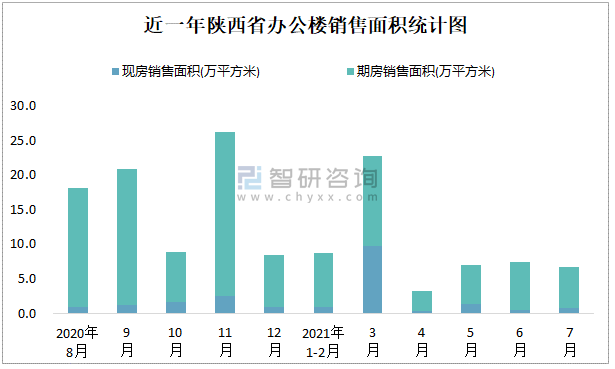 根據國家統計局數據可知:2021年7月陜西省辦公樓銷售面積為6.75萬平方米(其中銷售現房0.82萬平方米,期房5.93萬平方米);2021年1-7月陜西省辦公樓累計銷售面積為55.88萬平方米;近一年陜西省辦公樓期房銷售面積遠高于現房銷售面積,2021年7月四川、廣東、江蘇的辦公樓銷售面積最多,江蘇、上海、浙江、廣東的辦公樓現房銷售面積高于其他各省市。