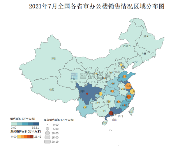 2021年7月全國各省市辦公樓銷售情況區域分布圖