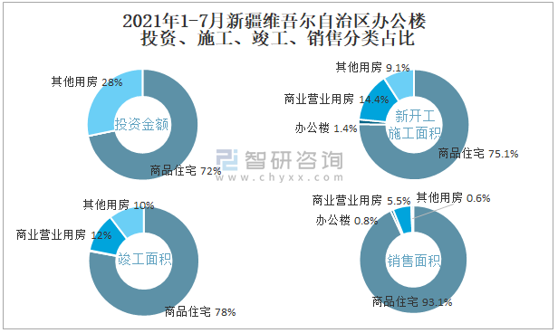 2021年1-7月新疆維吾爾自治區(qū)辦公樓投資、施工、竣工、銷售分類占比