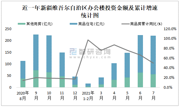 根據(jù)國家統(tǒng)計局?jǐn)?shù)據(jù)統(tǒng)計可知:2021年7月新疆維吾爾自治區(qū)房地產(chǎn)開發(fā)投資商品房投資金額為221.05億元,其中包括辦公樓、商業(yè)營業(yè)用房等其他用房55.73億元(注:辦公樓、商業(yè)營業(yè)用房未分開統(tǒng)計);2021年1-7月新疆維吾爾自治區(qū)房地產(chǎn)開發(fā)投資包括辦公樓在內(nèi)的其他用房累計金額為212.89億元。