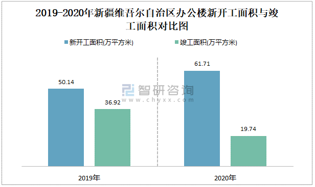 2019-2020年新疆維吾爾自治區(qū)辦公樓新開工面積與竣工面積對比圖