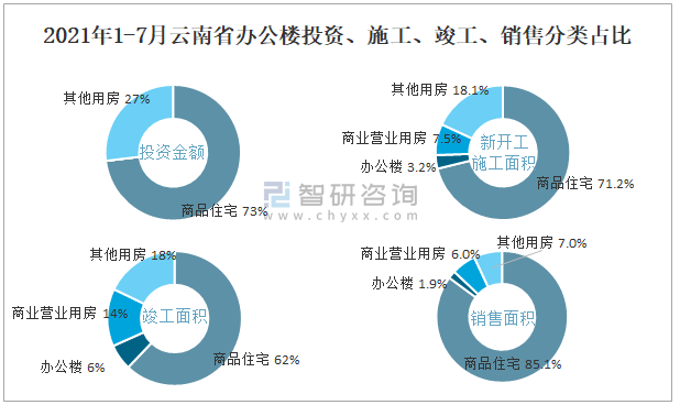 根據國家統計局數據統計可知:2021年1-7月云南省房地產開發企業在包括辦公樓在內的其他用房投資金額占比為26.9%(注:只有投資金額中其他用房包含辦公樓、商業營業用房),辦公樓的新開工面積與竣工面積所占比重差異不大,從銷售面積來看,辦公樓銷售面積占比少于商業營業用房銷售面積占比。