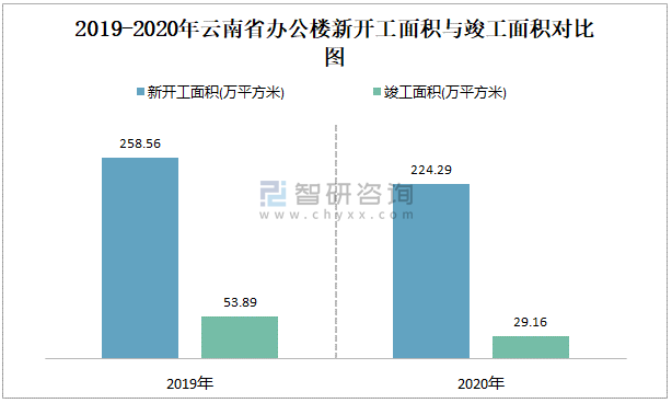 2019-2020年云南省辦公樓新開工面積與竣工面積對比圖