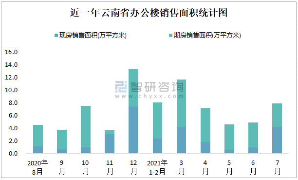 根據國家統計局數據可知:2021年7月云南省辦公樓銷售面積為7.88萬平方米(其中銷售現房4.22萬平方米,期房3.66萬平方米);2021年1-7月云南省辦公樓累計銷售面積為44.23萬平方米;近一年云南省辦公樓期房銷售面積遠高于現房銷售面積,2021年7月四川、廣東、江蘇的辦公樓銷售面積最多,江蘇、上海、浙江、廣東的辦公樓現房銷售面積高于其他各省市。
