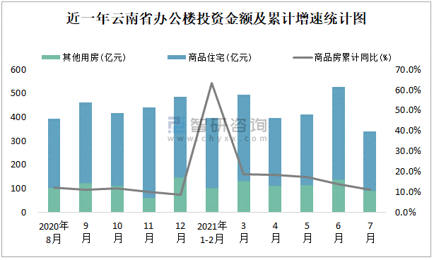 根據國家統計局數據統計可知:2021年7月云南省房地產開發投資商品房投資金額為341.18億元,其中包括辦公樓、商業營業用房等其他用房91.76億元(注:辦公樓、商業營業用房未分開統計);2021年1-7月云南省房地產開發投資包括辦公樓在內的其他用房累計金額為690.31億元。