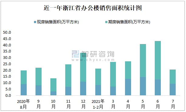根據國家統計局數據可知:2021年7月浙江省辦公樓銷售面積為20.66萬平方米(其中銷售現房9.18萬平方米,期房11.48萬平方米);2021年1-7月浙江省辦公樓累計銷售面積為180;近一年浙江省辦公樓期房銷售面積遠高于現房銷售面積,2021年7月四川、廣東、江蘇的辦公樓銷售面積最多,江蘇、上海、浙江、廣東的辦公樓現房銷售面積高于其他各省市。