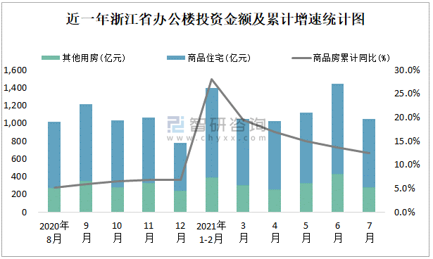 根據國家統計局數據統計可知:2021年7月浙江省房地產開發投資商品房投資金額為1045.84億元,其中包括辦公樓、商業營業用房等其他用房282.7億元(注:辦公樓、商業營業用房未分開統計);2021年1-7月浙江省房地產開發投資包括辦公樓在內的其他用房累計金額為1993.51億元。
