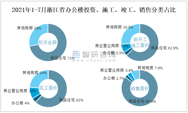 根據國家統計局數據統計可知:2021年1-7月浙江省房地產開發企業在包括辦公樓在內的其他用房投資金額占比為28.1%(注:只有投資金額中其他用房包含辦公樓、商業營業用房),辦公樓的新開工面積與竣工面積所占比重差異不大,從銷售面積來看,辦公樓銷售面積占比少于商業營業用房銷售面積占比。