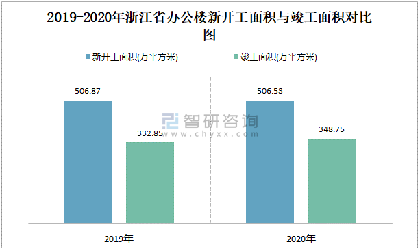 2019-2020年浙江省辦公樓新開工面積與竣工面積對比圖