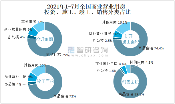 2021年1-7月全國商業(yè)營業(yè)用房投資、施工、竣工、銷售分類占比