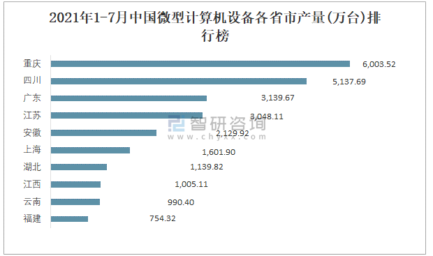 2021年1-7月中國微型計算機設備各省市產量排行榜