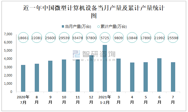 根據國家統計局數據顯示:2021年7月中國微型計算機設備產量為3597萬臺,同比增長10.3%;2021年1-7月中國微型計算機設備累計產量為25598萬臺,累計增長37.9%;2015-2020年中國微型計算機設備產量2016年跌至最低,此后逐年遞增。