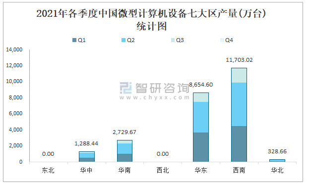 2021年各季度中國微型計算機設備七大區產量統計圖