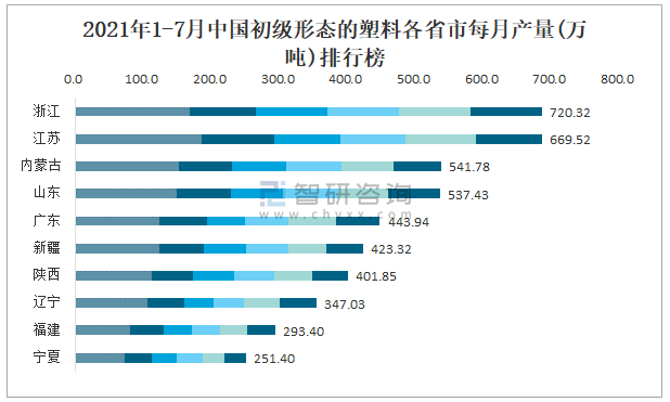 2021年1-7月中國初級形態的塑料各省市每月產量排行榜