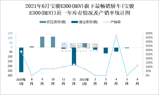 2021年6月寶駿E300(BEV)旗下最暢銷車(寶駿E300(BEV))近一年庫存情況及產(chǎn)銷率統(tǒng)計圖