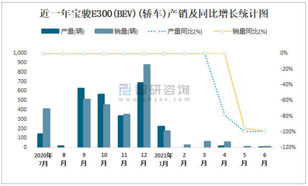 根據(jù)中國汽車工業(yè)協(xié)會數(shù)據(jù)可知:2021年6月寶駿E300(BEV)(轎車)產(chǎn)量為5輛,同比下降99.3%,銷量為6輛,同比下降99%,當(dāng)月產(chǎn)銷率為120%;2021年上半年寶駿E300(BEV)(轎車)產(chǎn)量為237輛,同比下降80.7%,銷量為332輛,同比下降57.5%,產(chǎn)銷率為140.08%;且2020年寶駿E300(BEV)(轎車)總產(chǎn)量大于總銷量,積壓了庫存220輛。