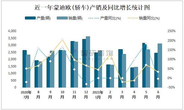 近一年蒙迪歐(轎車)產銷及同比增長統計圖