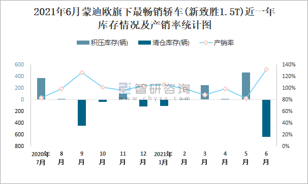 2021年6月蒙迪歐旗下最暢銷車(新致勝1.5T)近一年庫存情況及產銷率統計圖