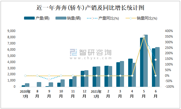 近一年奔奔(轎車)產銷及同比增長統計圖