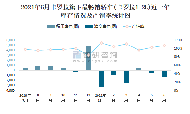 2021年6月卡羅拉旗下最暢銷車(卡羅拉1.2L)近一年庫存情況及產銷率統計圖
