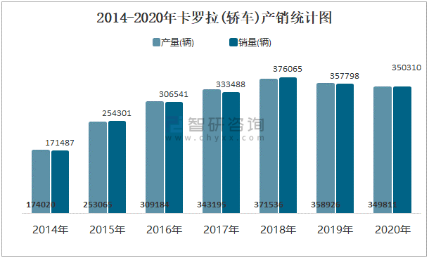 2014-2020年卡羅拉(轎車)產銷統計圖