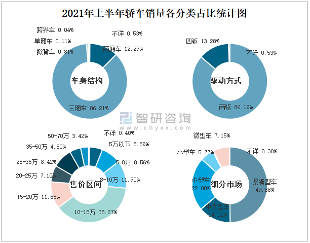 根據中國汽車工業協會數據統計可知:2021年上半年轎車總計產量為4550652輛,總計銷量為4643274輛;車身結構為三廂車型的占比最大,驅動方式為兩驅的轎車銷量最多,售價在10-15萬之間的轎車銷售情況最好,以及緊湊型車最受青睞。