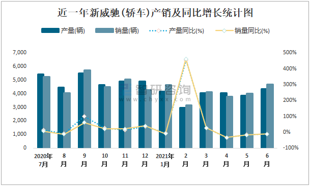 根據中國汽車工業協會數據可知:2021年6月新威馳(轎車)產量為4350輛,同比下降11.8%,銷量為4666輛,同比下降11.3%,當月產銷率為107.26%;2021年上半年新威馳(轎車)產量為23402輛,同比下降1.9%,銷量為24399輛,同比下降1.4%,產銷率為104.26%;2014-2020年新威馳(轎車)產銷量均在2014年達到最高值,此后總體呈現下降趨勢,且近7年總銷量大于總產量,清倉庫存837輛。