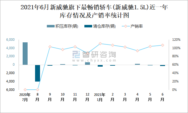 2021年6月新威馳旗下最暢銷車(新威馳1.5L)近一年庫存情況及產銷率統計圖