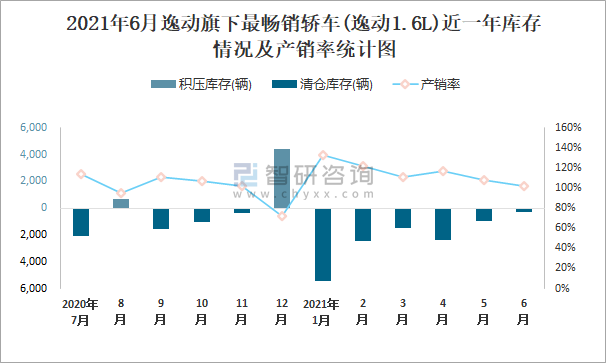 2021年6月逸動旗下最暢銷車(逸動1.6L)近一年庫存情況及產(chǎn)銷率統(tǒng)計圖