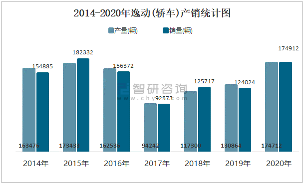 2014-2020年逸動(轎車)產(chǎn)銷統(tǒng)計圖