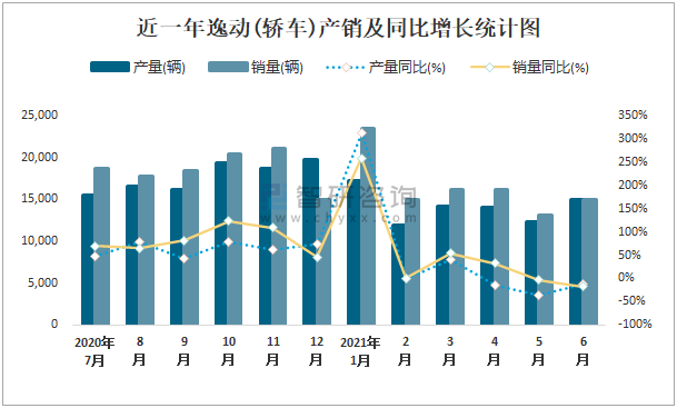 近一年逸動(轎車)產(chǎn)銷及同比增長統(tǒng)計圖