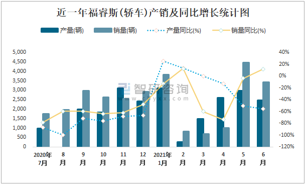 近一年福睿斯(轎車)產(chǎn)銷及同比增長統(tǒng)計(jì)圖