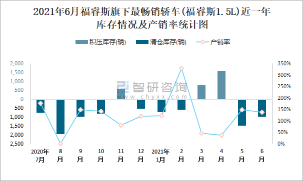2021年6月福睿斯旗下最暢銷車(福睿斯1.5L)近一年庫存情況及產(chǎn)銷率統(tǒng)計(jì)圖