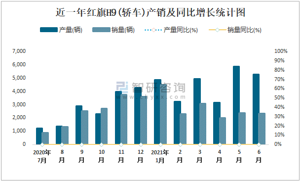 根據中國汽車工業協會數據可知:2021年6月紅旗H9(轎車)產量為5295輛,同比下降0%,銷量為2323輛,同比下降0%,當月產銷率為43.87%;2021年上半年紅旗H9(轎車)產量為27361輛,同比下降0%,銷量為16612輛,同比下降0%,產銷率為60.71%;且2020年紅旗H9(轎車)總產量大于總銷量,積壓了庫存1293輛。