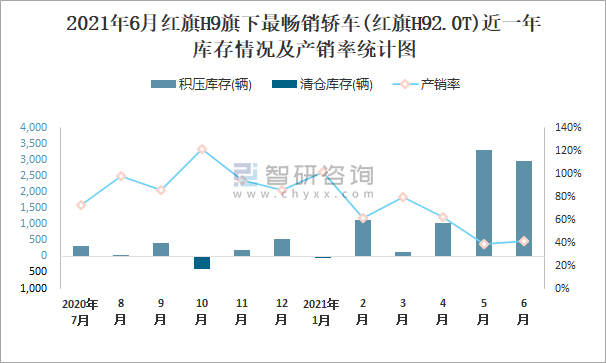 2021年6月紅旗H9旗下最暢銷車(紅旗H92.0T)近一年庫存情況及產銷率統計圖