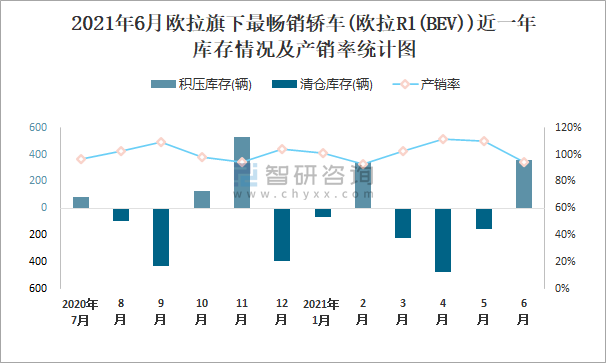 2021年6月歐拉旗下最暢銷車(歐拉R1(BEV))近一年庫存情況及產銷率統計圖