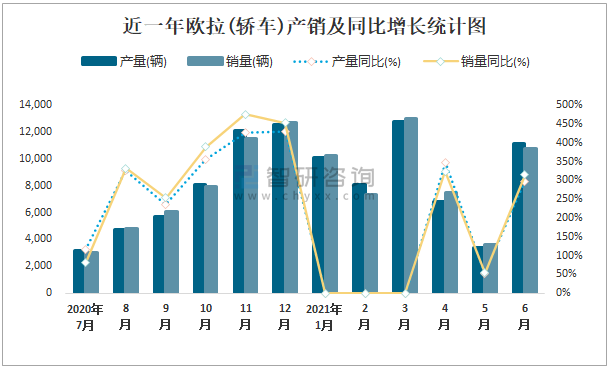 近一年歐拉(轎車)產銷及同比增長統計圖